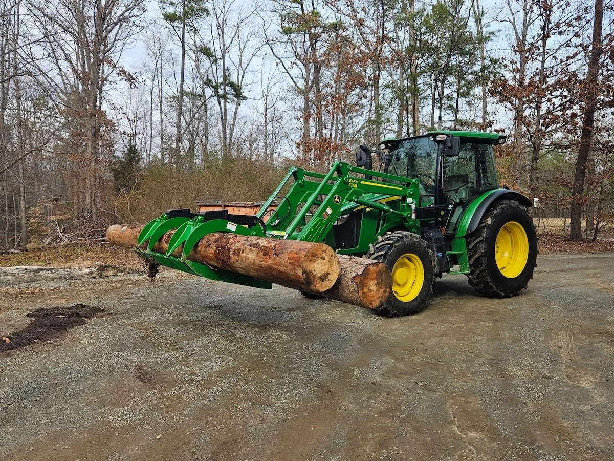 Laying Hen Coop Renovation: Remember the new grapple attachment we got?! We put it to use right away. Nat used it to load two giant pine logs on a trailer. Then he drove them down to Buckingham where our friend Mason at Bear Bottom Farm milled them into useable lumber: