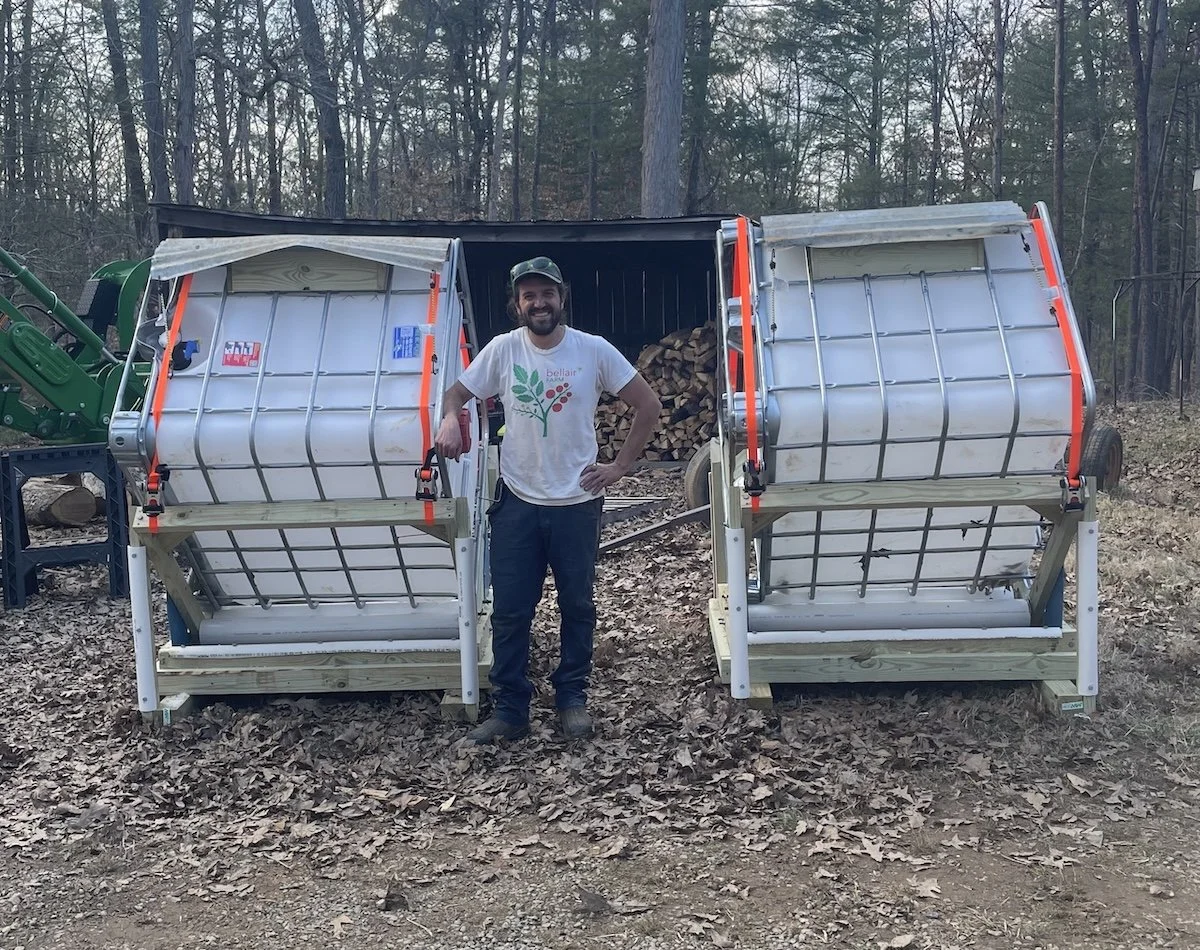 Two New Hog Feeders: Last week we hosted a special guest, Bellair alum George who now runs Kestral Hollow Farm in Earlysville. George helped build some of our existing hog feeders and thankfully was available to come back and build us two more. The original feeders are still working great, but have two more is helpful as we expand the herd and also if we need to pasture multiple groups of hogs in separate locations. These bulk feeders are made with modified IBC totes. We can easily fill the top with feed, and two PVC pipes at the bottom help control the flow of feed to minimize waste. The hogs jostle the pipes at the bottom to release feed.