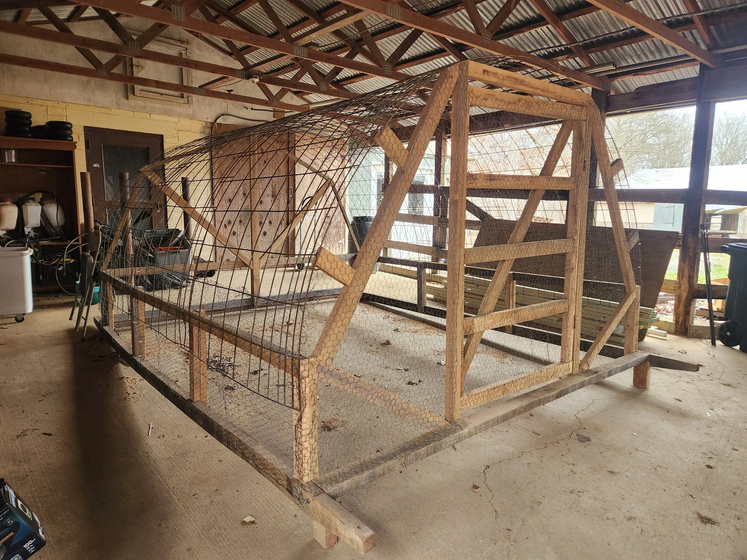 New Broiler Coop: Dale has been working on an upgrade for the other chickens as well. Similar to the laying coop, this new broiler coop design will be better for both the livestock crew and the chickens. This is a larger hoop design instead of the low Salatin-style coops. More room for the chickens, tall enough for the crew to stand up inside (instead of bending over the small coops) without compromising safety from predators. The entire structure is covered in chicken wire. This is not shown in the photo below, but eventually it will also have a tarp on top for shade/rain protection. This coop will rest directly on the ground on sleds, so we can move the coop every day using the ATV. The livestock crew were previously dragging the other coops along the ground by hand!