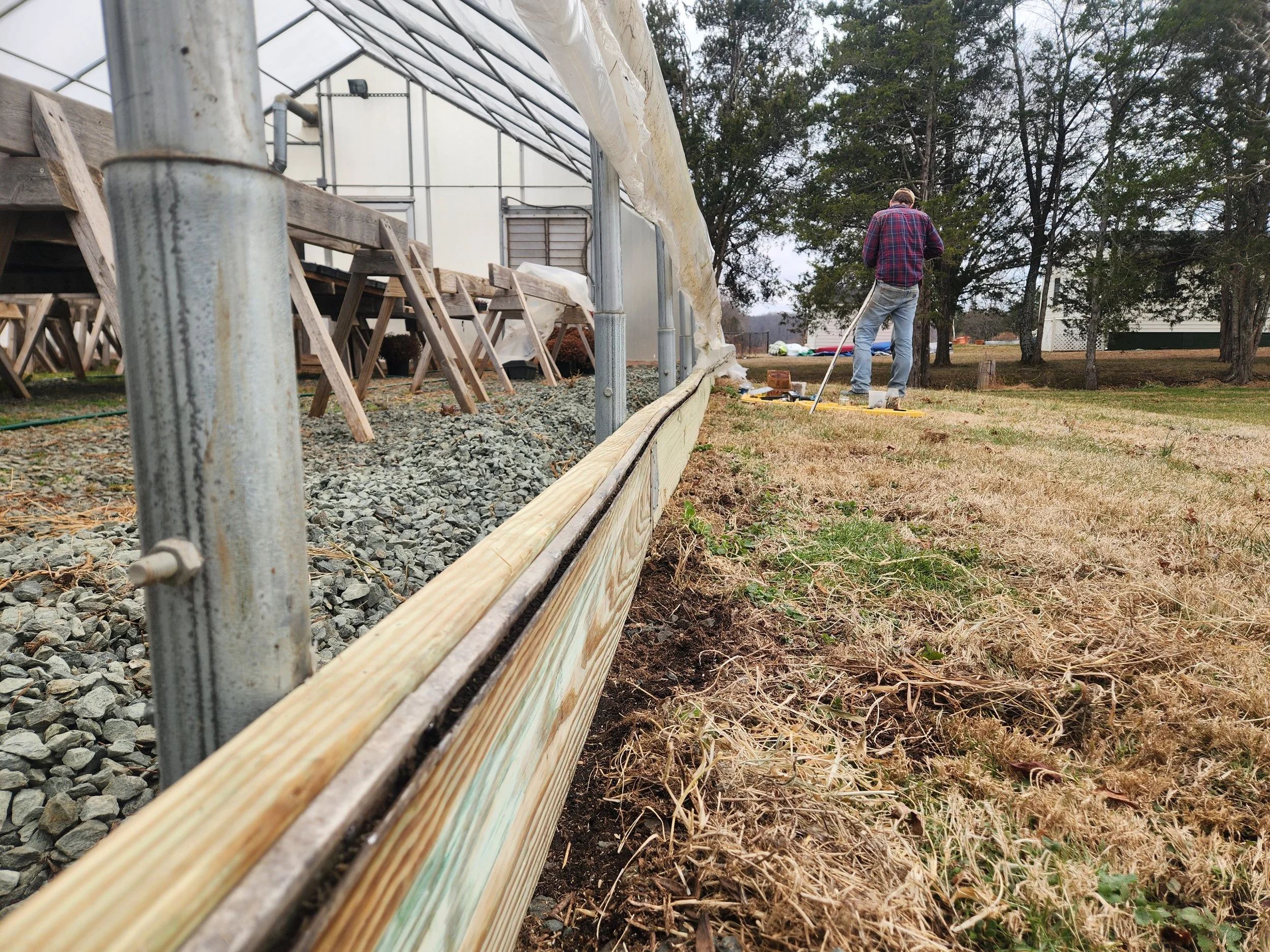 Greenhouse Maintenance: the baseboards of the greenhouse were in rough shape. Above, Clayton is working on replacing it. You can see where the greenhouse plastic was raised so that the old boards could be removed and replaced with new ones. The plastic can then be rolled back down and held in place with a wiggle wire.